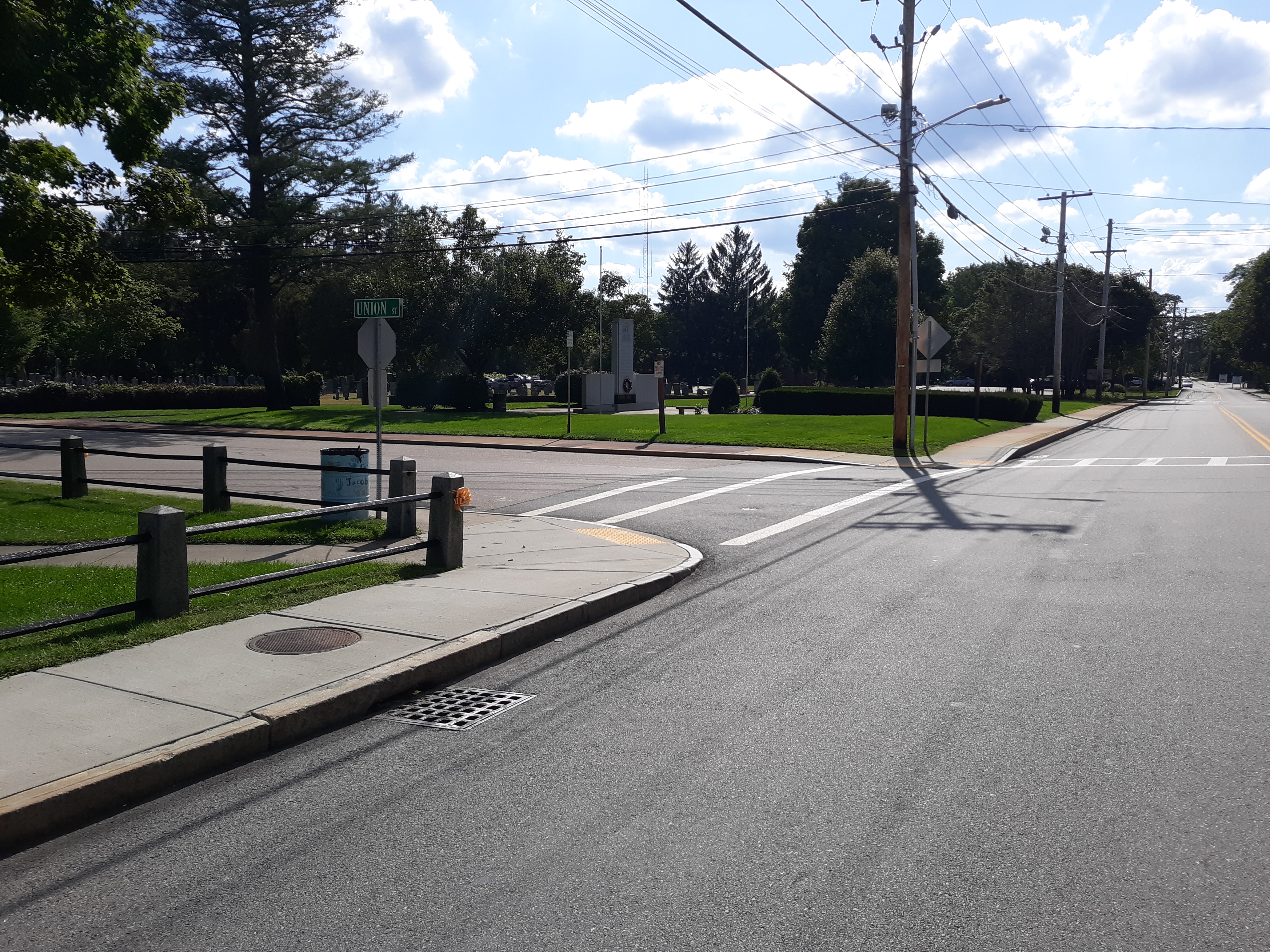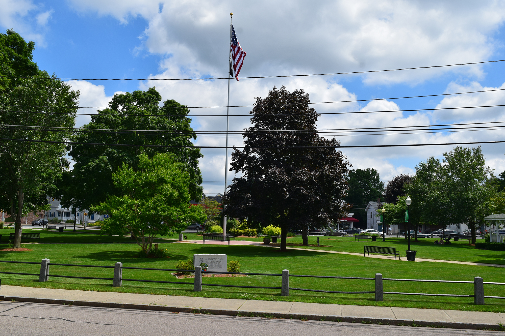 The stunning old Town Hall sat on a tiny lot at the corner of Union and West Streets. Built in 1883, it served as both the political and social hub of the town, hosting town offices as well as dances and many other functions. Fire claimed the Town Hall on December 20, 1970, and the lot is now a memorial to Mansfield's war veterans. |