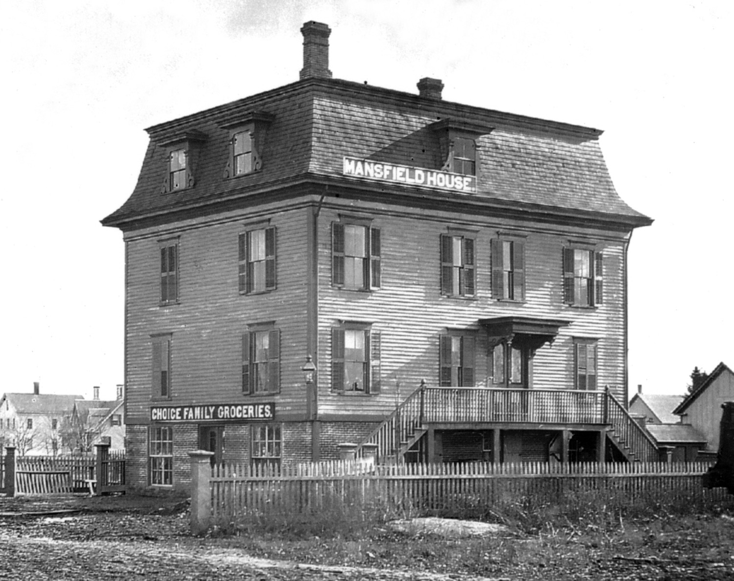 In 1858, Samuel B. Schenk constructed this famous building where Chauncy Street met the Old Colony Railroad. It had several names and many owners, but was best known as the Mansfield House. It operated as a hotel, restaurant, and watering hole for nearly 130 years. In 1933, owner Joe Roman obtained Mansfield's first post-prohibition license to serve liquor t the property, adding to the building's storied history. The Mansfield House was torn down in 1985. |